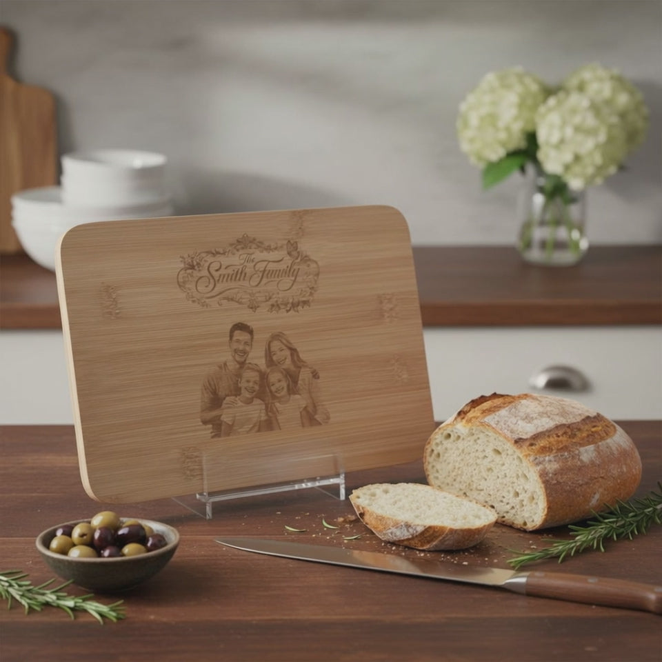 Turn everyday moments into lasting memories with our custom engraved family cutting board. Crafted from durable bamboo and personalized with your family name and photo, this piece is more than a kitchen essential — it’s a heartfelt keepsake.